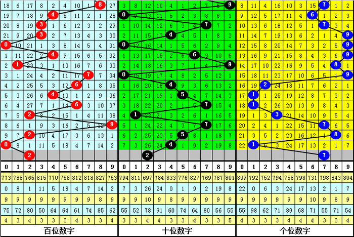 在历史同期号码中,组选0-9号码出现次数为:3出现1次,号码5出现3次,号码8、9出现5次,号码0、1、2出现7次,号码4出现8次,号码6出现9次,号码7出现14次,本期看好两码2、2出现。