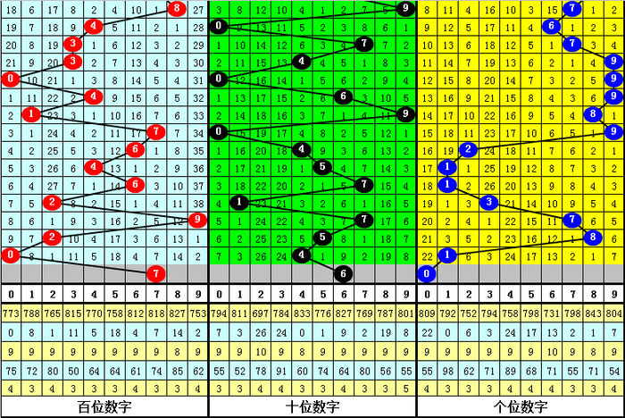 百位号码:第24070期-24074期奖号为:6-2-9-2-0,振幅为9点,分布较分散,本期预计百位走高,关注号码7。