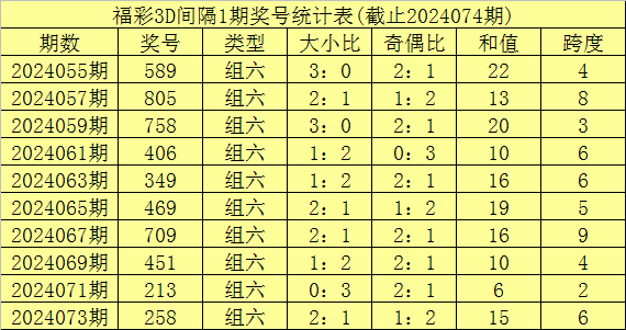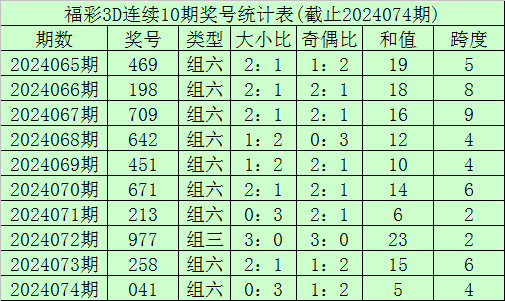 开奖回顾:福利彩票3D第24074期奖号开出041。奖号类型为组六,奇偶形态为偶偶奇,大小形态为小小小。