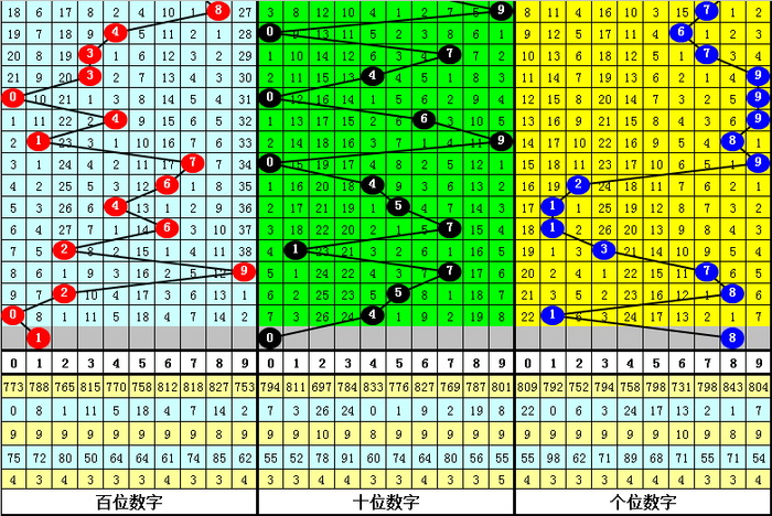 百个位合:前10期百个位两码合开出:3、9、6、8、5、7、5、6、0、1,其中百个位两码合012路比为5:2:3,奇偶比为6:4,本期看好百个位两码合开出奇数,注意两码合1、3、9。