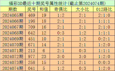开奖回顾:第2024074期福彩3D奖号为041。奖号形态为组六,大小比为0:3,和值为5,奇偶比为1:2,012路比为1:2:0,跨度为4。