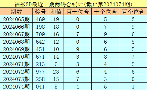 百十位合:最近10期百十位号码合分别开出:0、0、7、0、9、3、3、6、7、4,其中百十位合大小比为4:6,012路比为7:3:0,本期预计百十位两码合出现小数,关注两码合1、3、4。