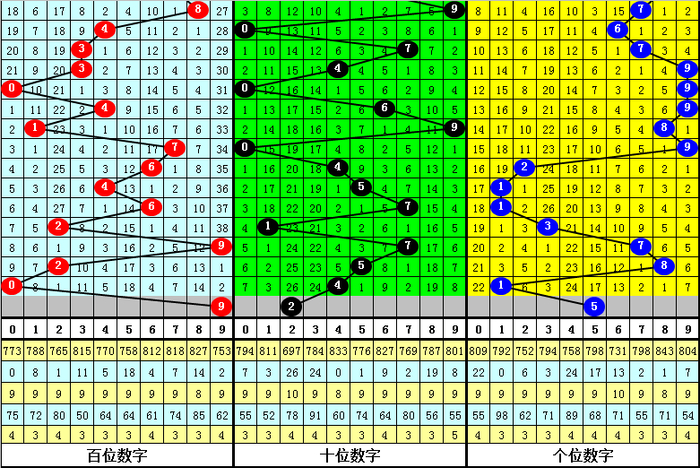 (2)在号码频次方面,开出个数最少的三个号码为:3、2、1,一般来说这三个号码不会同时出现,本期杀一码3;开出个数最多的四个号码分别为:9、4、7、0,本期看好这四个号码中包含1-2个开奖号码,胆码参考0。9。