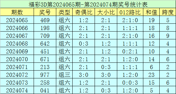 上期回顾:福彩3D第2024074期开奖号码为041,组选类型为组六,奇偶比为1:2,大小比为0:3。