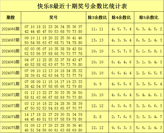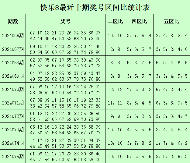 福彩快乐8第2024075期开奖回顾:01 09 12 17 20 23 28 30 36 40 46 51 54 56 60 61 63 68 69 80,其中奖号二区比为10:10,四区比为5:5:5:5,五区比为3:5:3:6:3,除2余数比为8:12,除4余数比为9:5:3:3,除5余数比为5:6:2:4:3。