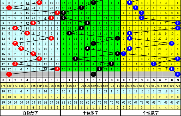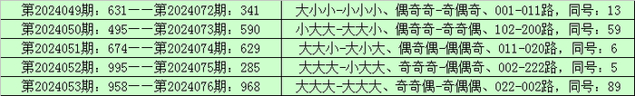 统计排列三已开出的奖号发现,在连续5期(第2024049期-第2024053)奖号为:631-495-674-995-958。