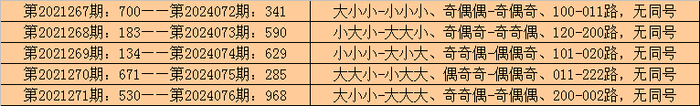 在排列三历史开奖中,第2021267期-第2021271期连续5期奖号为:700-183-134-671-530。