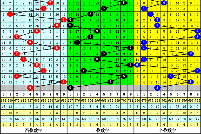 百位分析:该位上期奖号为9,出现0路、奇数、大号,在前11期奖号,该位012路比为3:1:7,2路号码最多,目前012路号码遗漏期数分别为0、7和1,近期百位注意1路号码走热。