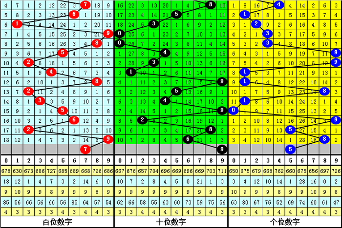 3、在以上0-9号码频次中,号码奇偶比为39:34,大小比为45:28,本期预计百位开出大号,参考号码7。
