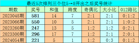 1、排列三前两期个位分别开出号码5和8,历史上个位号码连续两期分别出现5和8时,共有71次。在最近5次出现时,其下期分别出现号码:581、550、247、296、221;