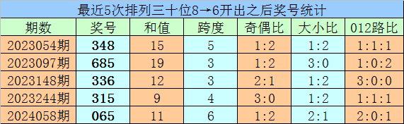 1、最近两期排列三十位号码开出号码分别为8和6,历史上十位号码连续两期同时出现号码8和6的奖号共开出73期。最近五次下期开出号码为:348、685、336、315、065;