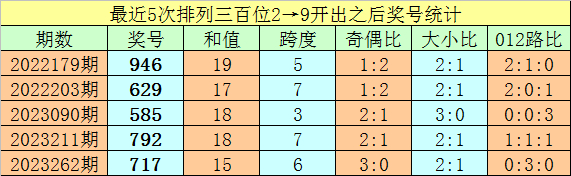 1、排列三最近两期百位号码分别开出2和9,历史上百位号码连续两期分别开出2和9的奖号出现了74期。前五期开出之后其下期奖号分别为:946、629、585、792、717;