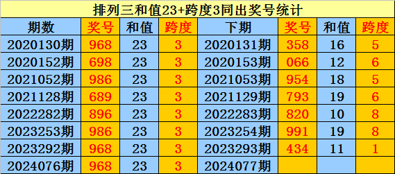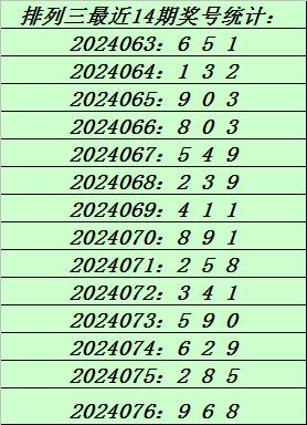 上期回顾:排列三第2024076期奖号:968。和值23,跨度3。