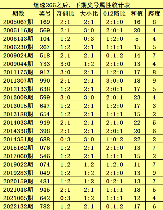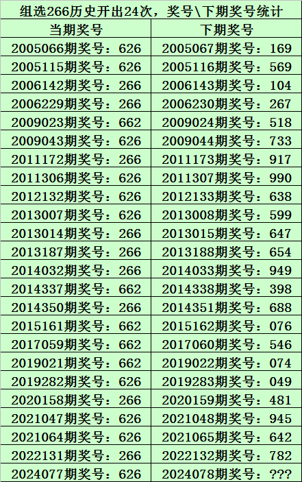 二、组选266分析:排列三历史上已开出24次组选号码266了,其奖号和下期开出奖号统计如下: