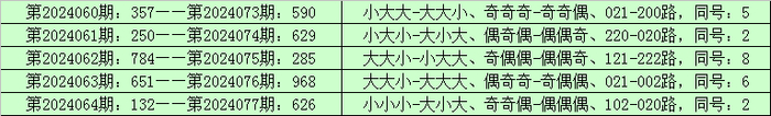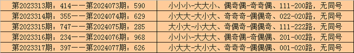 所以,排列三第2023318期奖号:790,与排列三第2024078期奖号可能没有同号。且排列三第2024078期奖号大小比、奇偶比和012路比不会与第2023318期奖号直选形态:大大小、奇奇偶和100路全部相同。