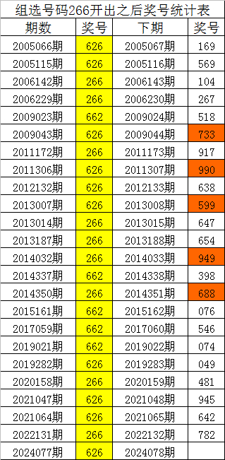 体彩排列三组选号码266历史上出现了24次,其下期奖号分别为:169、569、104、267、518、733、917、990、638、599、647、654、949、398、688、076、546、074、049、481、945、642、782,详细统计见下表: