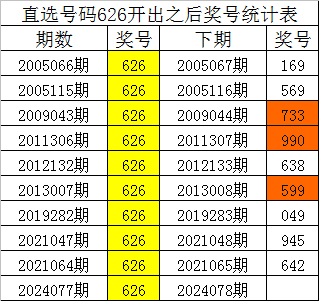 从上表统计可以看出,直选号码626开出之后,其下期奖号:
