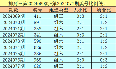 上期回顾:排列三第2024077奖号开出626,奖号质合比为1:2,大小比为2:1,跨度为4,类型为组三。