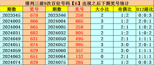 百位号码:百位上期奖号为2路、偶数、大号:6,历史上百位号码6共开出690期,前一次开出期数在第2024074期,上期奖号隔2期再次开出。