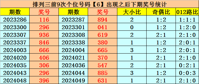 个位号码:上期奖号为大号、偶数、0路号码:6,历史上个位号码6共开出676期,前一次出现在第2024048期,上期遗漏28期再出。