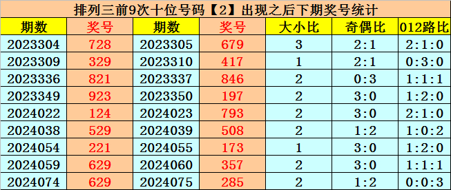 在十位前9次出现号码2后,其下期奖号分别开出:7-1-4-9-9-0-7-5-8,其中奖号个数012路比是3:4:2,奇偶比是6:3,大小比是6:3。