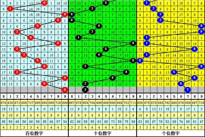 在百位前9次出现号码6之后,下期百位分别开出奖号:2-6-2-8-4-9-3-1-2,其中开出号码个数012路比是3:2:4,奇偶比是3:6,大小比是3:6。