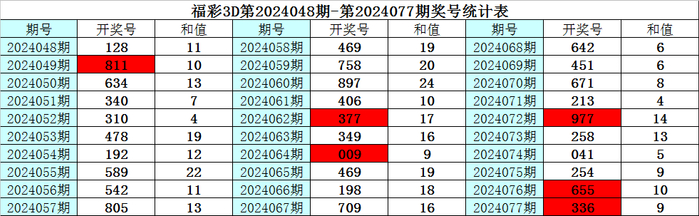 上期回顾:福彩3D第2024077期奖号为:336,其中奖号组选类型为:组三,奇偶比为2:1,大小比为1:2,012路比为3:0:0,和值为12,跨度为3。