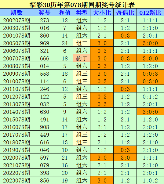组选类型判断:在第078期历史同期开奖中,组六开出15次,组三开出6次,豹子开出1次,今年同期看好开出组六号码。