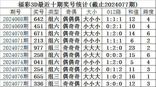 开奖回顾:福彩3D第2024077期奖号为336,奖号形态为:组三、小小大、3:0:0、奇奇偶。