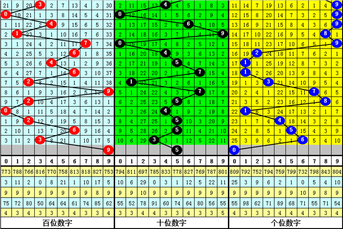 第一位上期奖号为3,走小3点,本期注意该位走大,看好号码9。