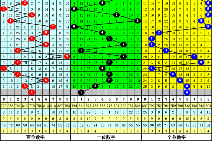 (2)在号码频次方面,开出个数最少的三个号码为:2、8、0,一般来说这三个号码不会同时出现,本期杀一码2;开出个数最多的四个号码分别为:4、7、9、6,本期看好这四个号码中包含1-2个开奖号码,胆码参考6。4。