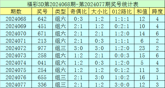 上期回顾:福彩3D第2024077期开奖号码为336,组选类型为组三,奇偶比为2:1,大小比为1:2。