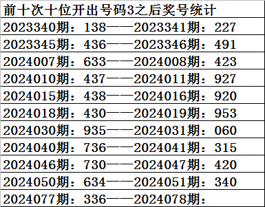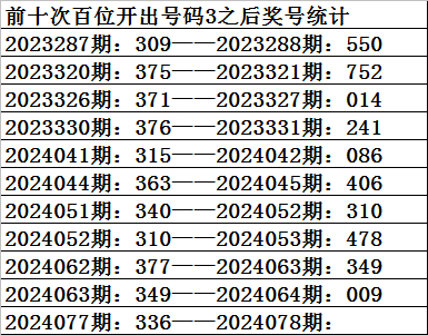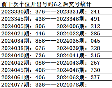 一、上期开奖:福利彩票3D第2024077期奖号为336。奇偶比为2:1,大小比为:1:2,奖号和值为12,奖号跨度为3。