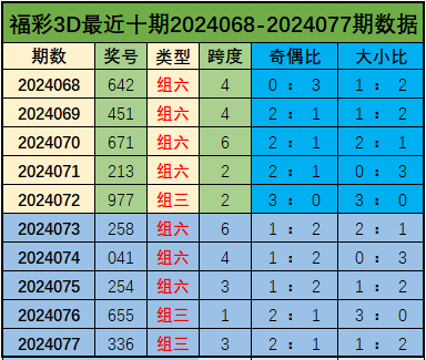 开奖回顾:福彩3D第2024077期奖号为336,其中奖号012路比为3:0:0,大小比为1:2,奇偶比为2:1,和值为12,跨度为3。