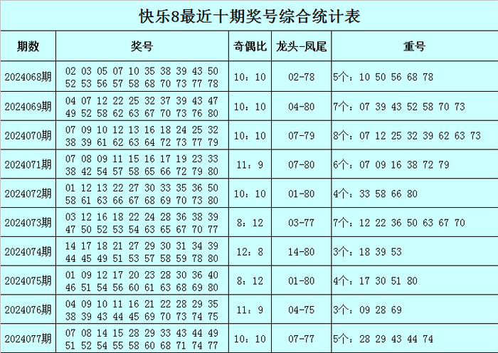 福彩快乐8第2024077期开出奖号:07 08 14 15 28 29 33 43 44 49 51 52 54 55 58 60 68 71 74 77,其中奖号奇偶比为10:10,出现5个重号28、29、43、44、74,开出连码07 08、14 15、28 29、43 44、51 52、54 55。