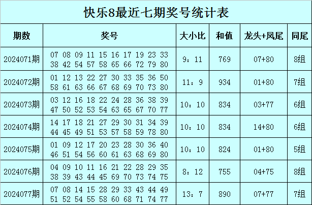 福彩快乐8第2024077期开奖回顾:07 08 14 15 28 29 33 43 44 49 51 52 54 55 58 60 68 71 74 77,其中奖号大小比开出13:7,和值为890,跨度为70,包含7组同尾号:51 71、33 43、14 44 54 74、15 55、07 77、08 28 58 68、29 49。