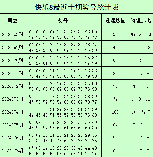 杨光快乐8第2024078期奖号冷温热分析(定义:遗漏0-1期号码为热码,遗漏2-4期号码为温码,遗漏4期以上号码为冷码)