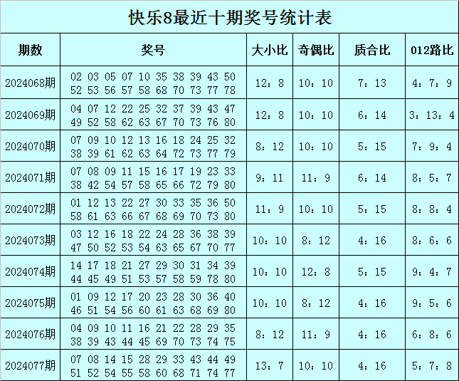 福彩快乐8第2024077期开奖回顾:07 08 14 15 28 29 33 43 44 49 51 52 54 55 58 60 68 71 74 77,其中奖号大小比开出13:7,奇偶比开出10:10,质合比开出4:16,012路比开出5:7:8。