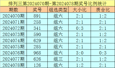 上期回顾:排列三第2024078奖号开出126,奖号质合比为2:1,大小比为1:2,跨度为5,类型为组六。