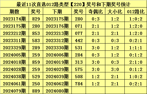 排列三上期开出奖号为:889,其直选012路类型为220,历史上直选220号码已开出了230次,最近11期分别开出奖号为:829、280、853、583、289、259、859、259、529、250、889。
