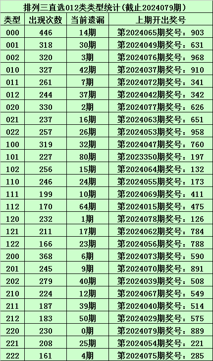 上期回顾:体彩排列三第2024079期开出奖号:889,其012路比为1:0:2,奖号012路类型为:220。