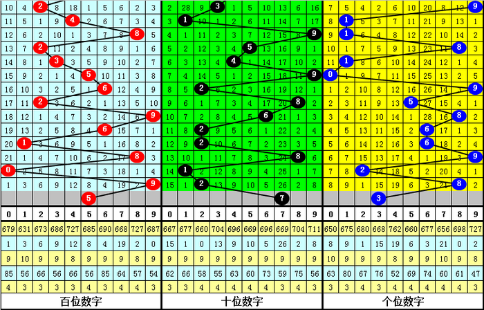 另外,在组选0-9的号码分布中,号码0、4、5、6、7表现最冷,开出11次;号码2走势最热,开出了16次。本期预计号码组024567中落号,参考号码0567。
