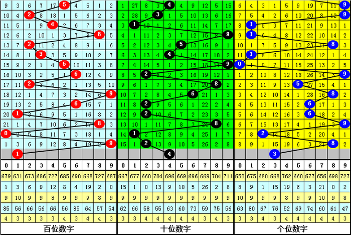 百位分析:该位上期奖号为9,出现0路、奇数、大号,在前11期奖号,该位012路比为6:1:4,1路号码最冷,目前012路号码遗漏期数分别为0、3和2,近期百位注意1路号码走热。