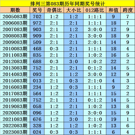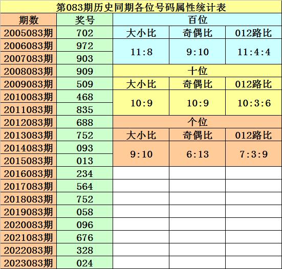 本期为排列三第2024083期开奖,历史上排列三第083期已开出了19期奖号了: