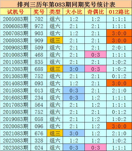 组选类型推荐:历史上排列三第083期同期奖号中,组六出现16期,组三出现3次,今年第083期注意组三号码。