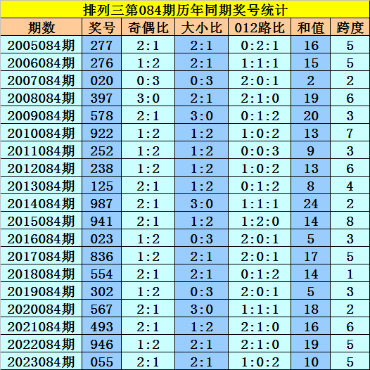 本期为排列三第2024084期开奖,历史上排列三第084期已开出了19期奖号了: