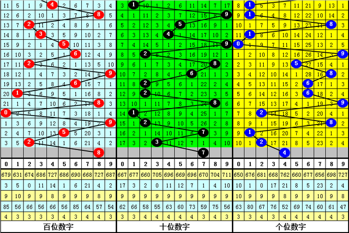 跨度判断:连续10期跨度开出012路比为3:5:2,012路跨度基本持平,跨度最近3期遗漏值分别为6期、6期和3期,本期预计跨度遗漏值走大,防温冷跨度解冻,参考跨度4。