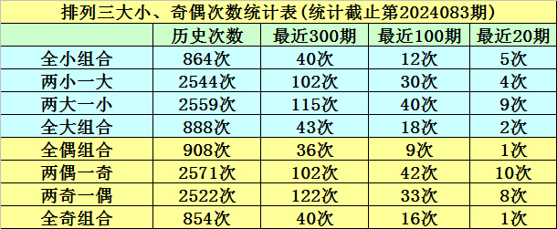 连续10期奖号中,两小一大形态开出1期,两大一小形态开出5期,全大形态开出2期,全小形态开出2期,本期大小形态判断:两大一小奖号。