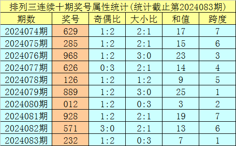 上期回顾:排列三第2024083期奖号:232。类型:组三,奇偶形态:偶奇偶,大小形态:小小小,和值:7,跨度:1。