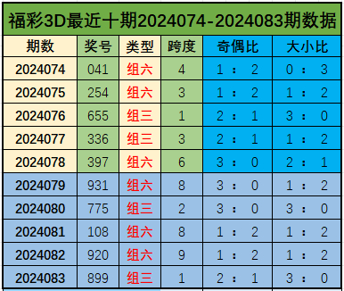 开奖回顾:福彩3D第2024083期奖号为899,其中奖号012路比为2:0:1,大小比为3:0,奇偶比为2:1,和值为26,跨度为1。